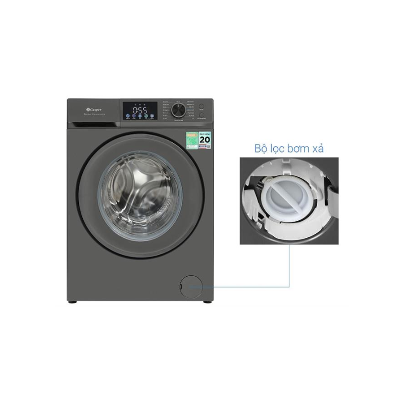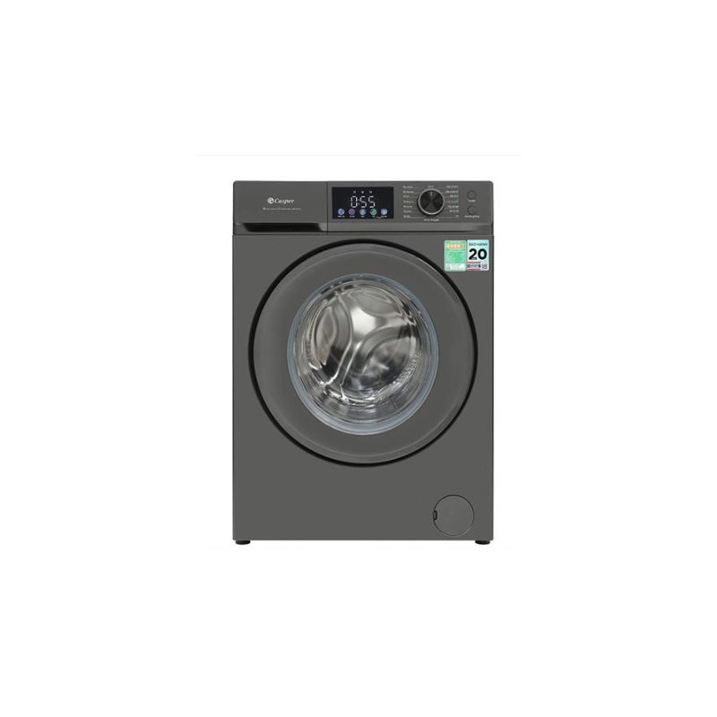 Máy giặt Casper Inverter 10.5 kg sở hữu thiết kế cửa trước - lồng ngang với tông màu xám đậm hiện đại, phù hợp với các không gian sống sang trọng như căn hộ chung cư, nhà phố hay phòng giặt riêng biệt.