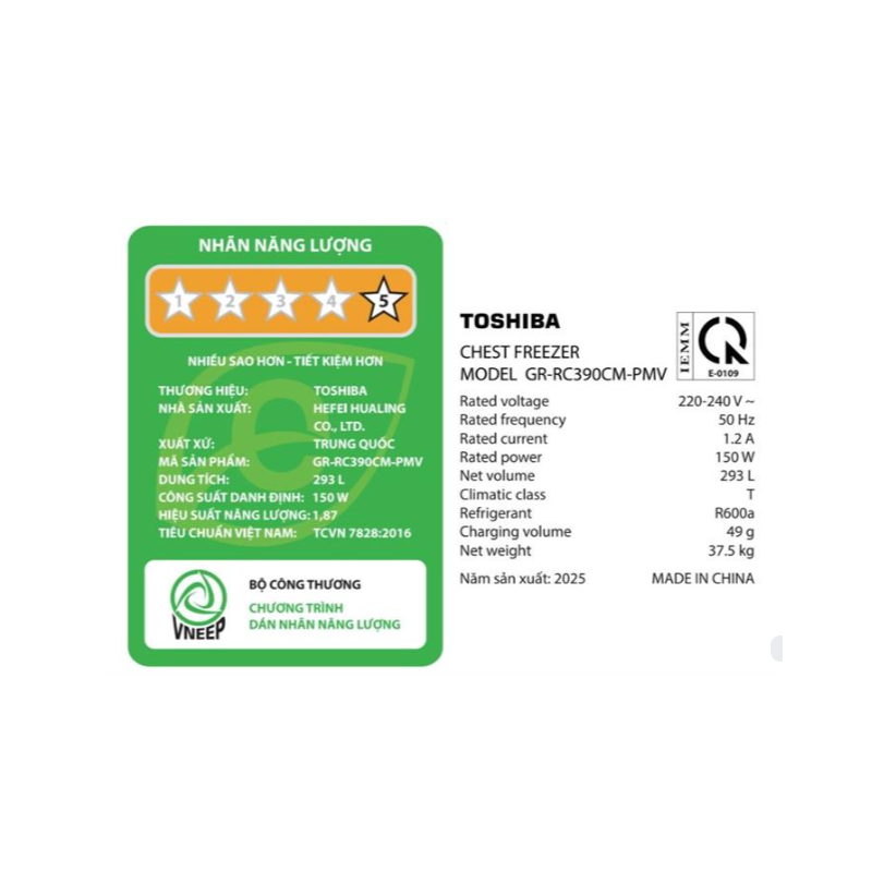 Tủ đông Toshiba Inverter 293 lít GR-RC390CM-PMV(01) tiết kiệm điện với công nghệ Inverter, dàn lạnh đồng bền bỉ và khả năng giữ đông đến 100 giờ khi mất điện. Sản phẩm phù hợp cho gia đình đông người hoặc cửa hàng nhỏ cần bảo quản thực phẩm lâu dài.